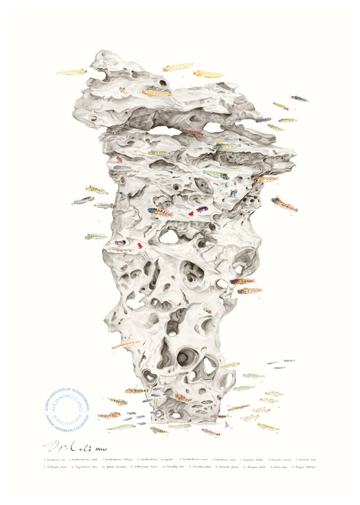 Illustration of 19 species of Chaenopsid, Stichaeid, Tripterygiid, Gobiid and Gobiesocid fishes, commissioned by the Marine Vertebrate Collection of Scripps Institution of Oceanography, to celebrate Professor Philip Hastings’ achievements in fish taxonomy. 2022