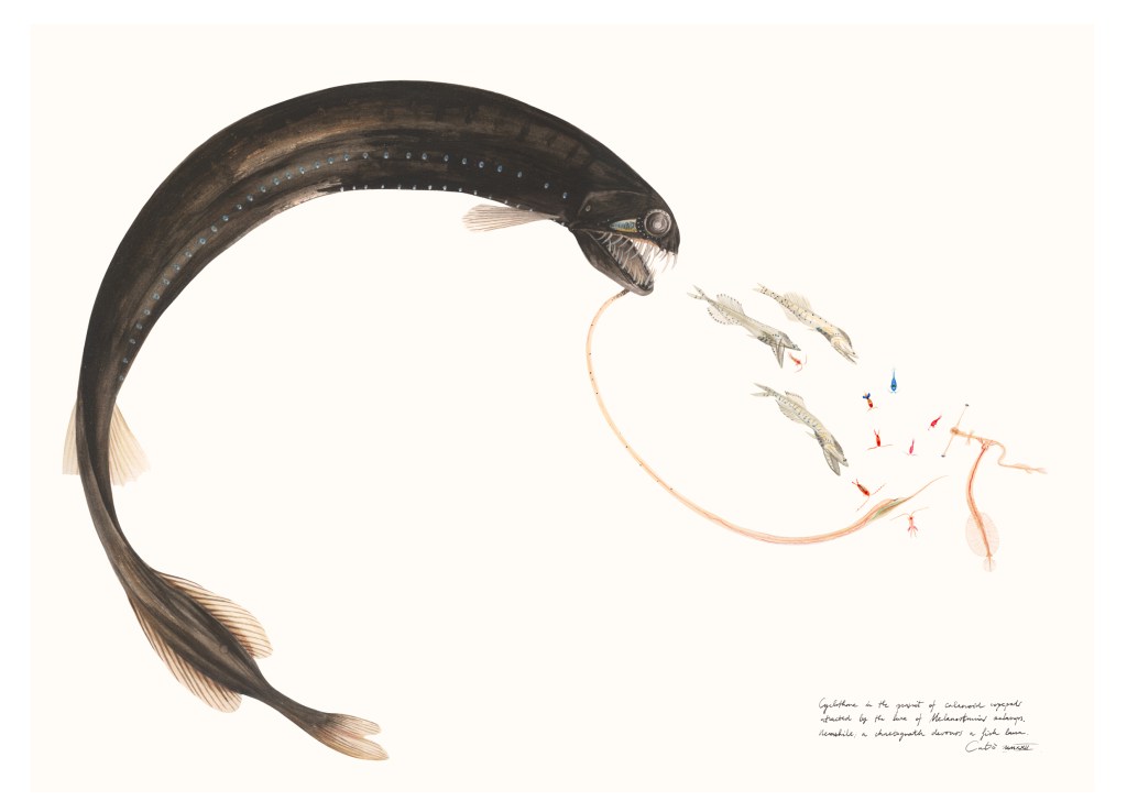 Cyclothone signata in pursuit of calanoid copepods atracted by the lure of Melanostomias melanops. Meanwhile, a chaetognath devours a fish larva. ‘Predators get eaten’, Scripps Institution of Oceanography, 2022