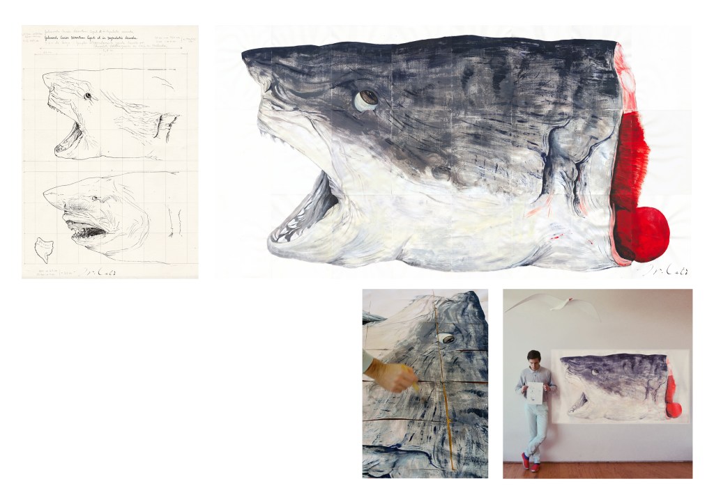 Study of the head of a Shortfin Mako, from 2015, composed of 14 A4 papers. It measures 1.47 meters in length. With a forced perspective of the cut, the head is presented as an animal-by-product, as waste detached from the valuable portion that is lost, inviting the viewer to creatively reconstruct the whole body of the fish.