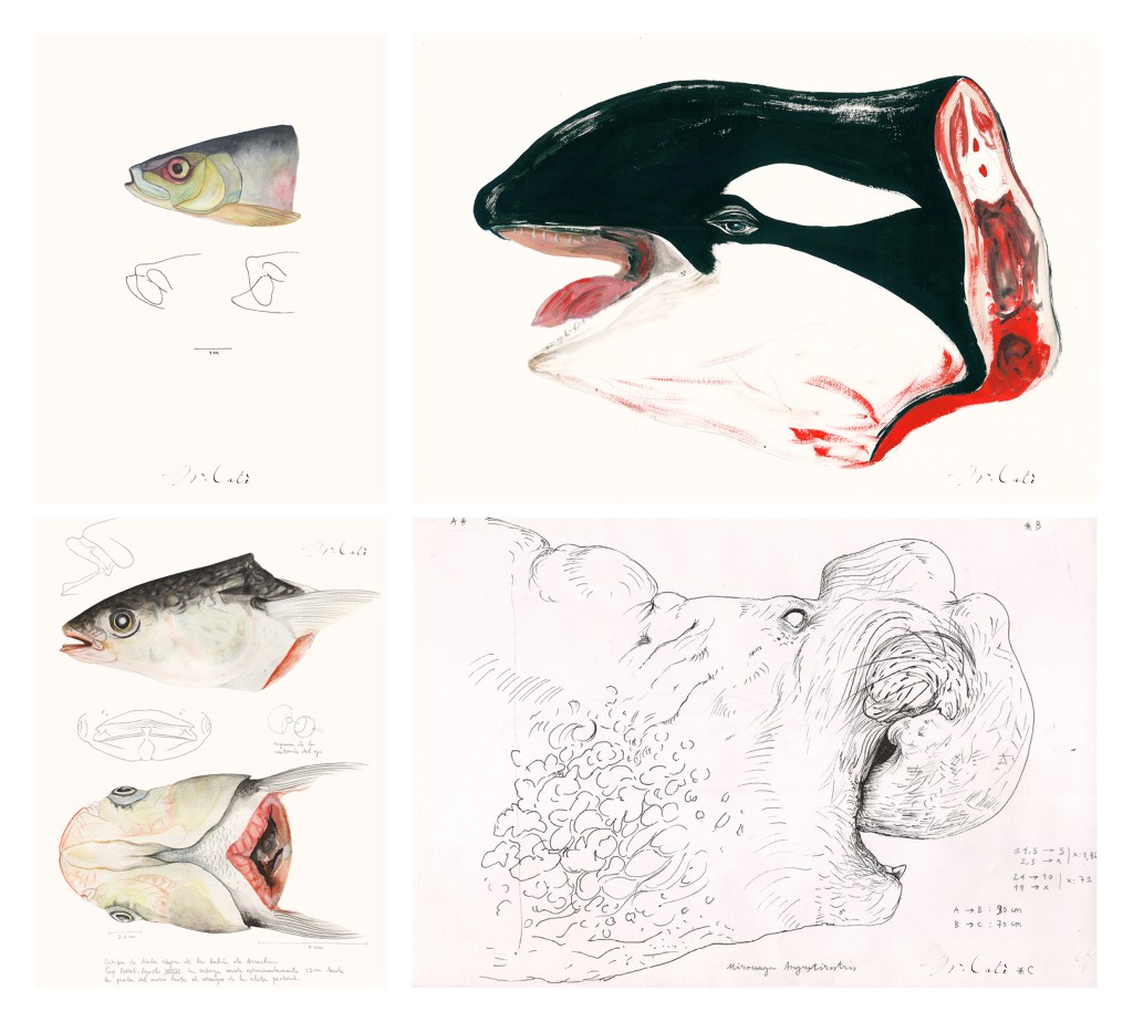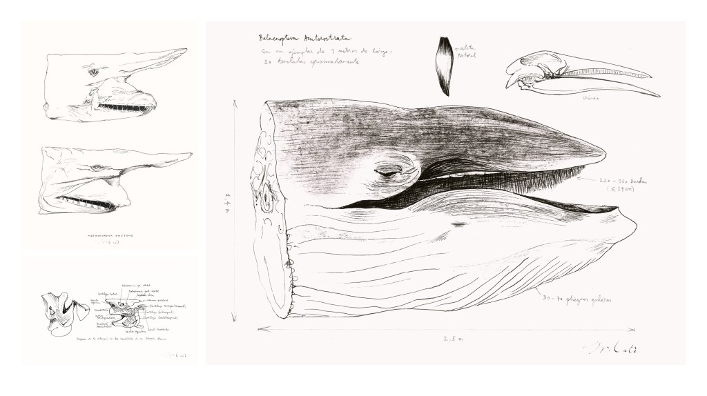 Upper left: Preparatory drawing for two decomposing heads of Mitsukurina owstoni. Lower left: Anatomical sketch of the mandible of Carcharodon carcharias. Right: Preparatory drawing for a ‘Cacho’ of Balaenoptera acutorostrata.
