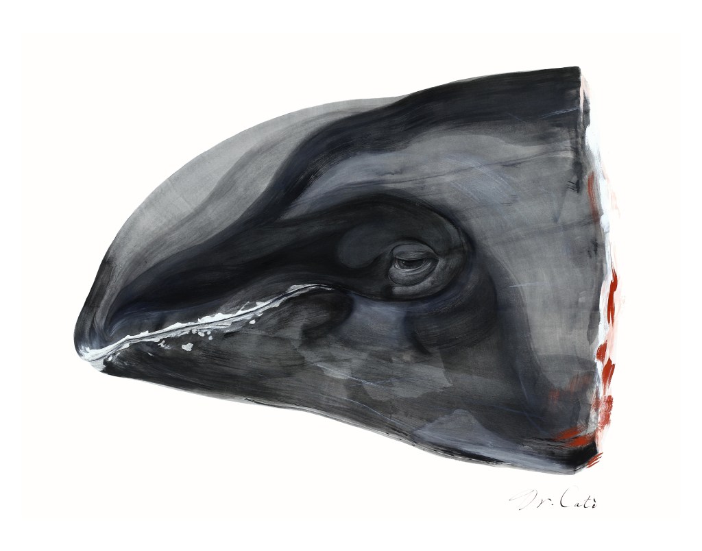 A life-size depiction of the head of Peponocephala electra, the melon headed whale, and Tursiops truncatus, the bottlenose dolphin. These watercolors are part of a project that illustrates the morphology of the acoustic organs within the head of odontocetes. 2020.