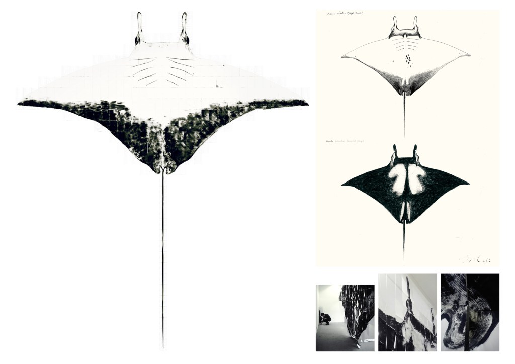 (right) Two preparatory drawings of the dorsal and ventral views of a manta ray, and three photographs of the installation during the 2011 Slade Degree Show.